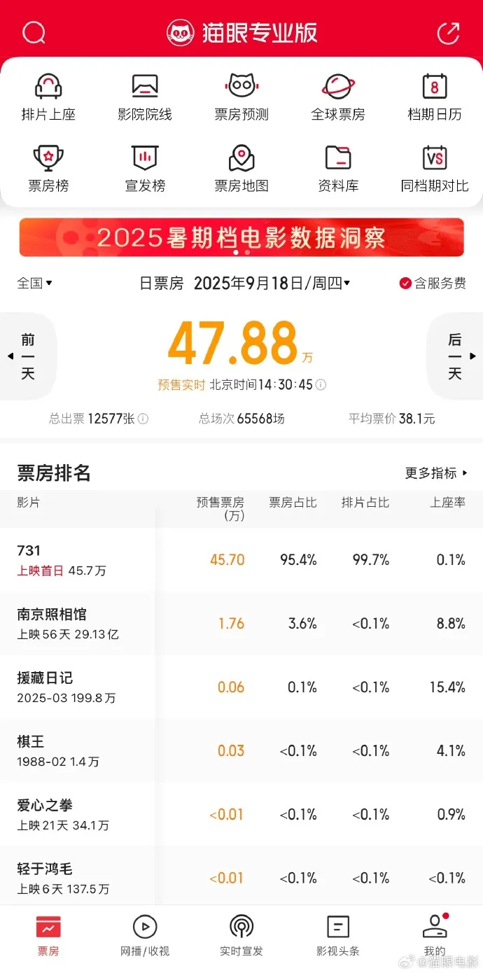 电影《731》定档于9月18日“九一八”事变94周年纪念日上映,此前猫眼、淘票票双平台“想看”人数超百万。